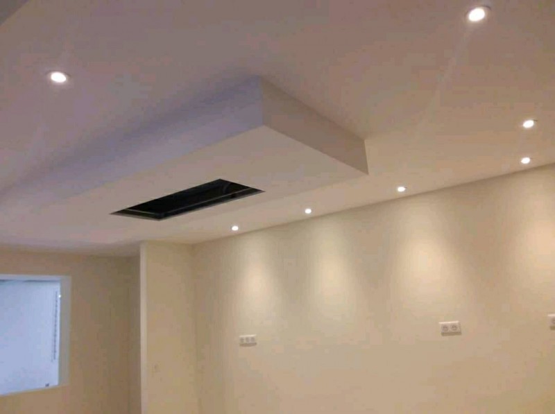 La disposition des spots en encastré apporte un un confort visuel et un côté chaleureux, les spots sont disposés de façon rectiligne afin de maximiser la lumière, d'avoir une zone bien éclairée, sans zone d'ombre sur un plan de travail, et un îlot central (zones de cuisson, de préparation, zone pour l'évier).