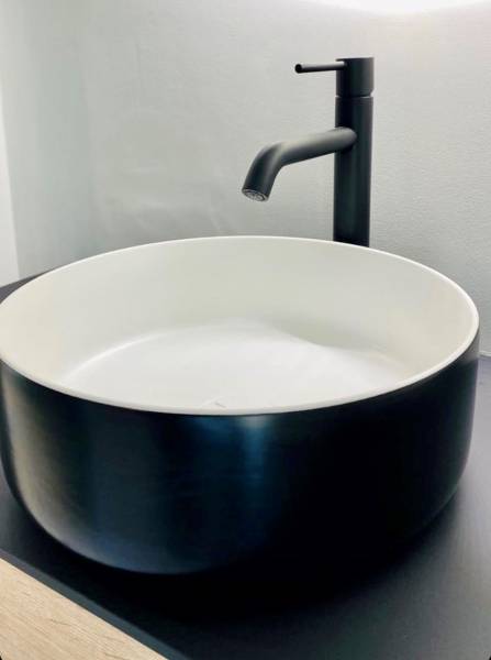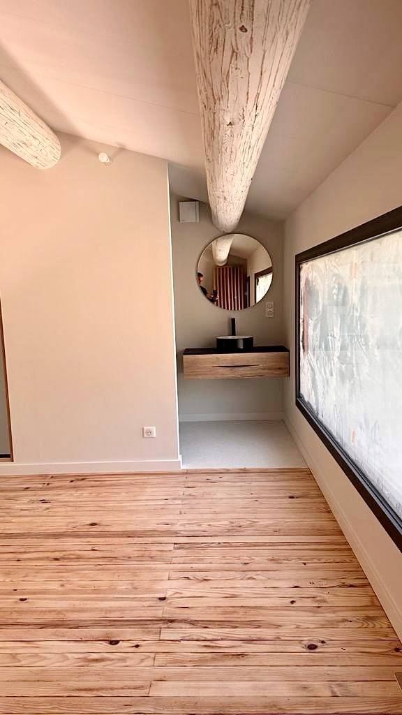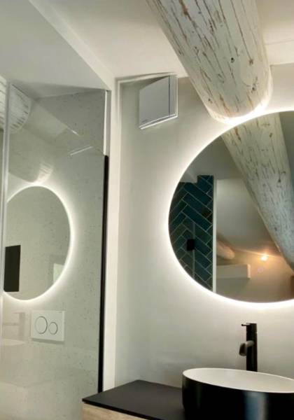 L'aménagement de cette pièce est composée d'un meuble suspendu en bois ce qui donne un côté chaleureux, combiné avec de la robinetterie et une vasque à poser noires pour un côté design, le grand miroir rond lumineux vient parfaire une ligne contemporaine.