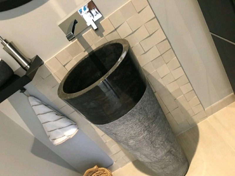 Côté WC, le client a pu installer ce superbe lavabo totem design à poser au sol, il s'intègre ainsi facilement dans son wc spacieux, l'aspect bicolore et bi-matière provient du marbre poli sur la partie haute et du marbre brut sur le pied, taillé dans la masse. Un lavabo qui ne passe pas inaperçu, très moderne et chic.