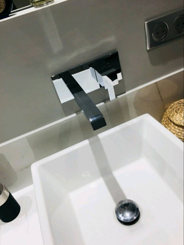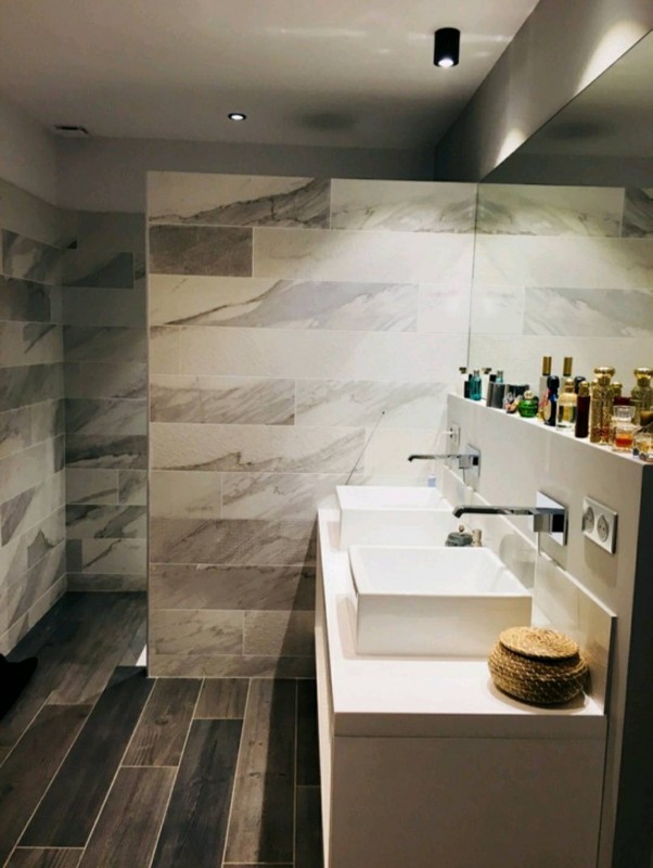 Le client souhaitant faire la rénovation complète de sa maison, il désirait avant tout la moderniser, le meuble sous vasques blanc fabriqué sur mesure par un menuisier avec lequel Mr Dell'Anna a l'habitude de travailler, apporte une ambiance moderne, épurée et sobre. Il bénéficie ainsi d'une salle de bain singulière avec une pièce unique sur mesure. Les vasques carrées et la robinetterie encastrée rectangulaire complète avec harmonie cette salle de bain.