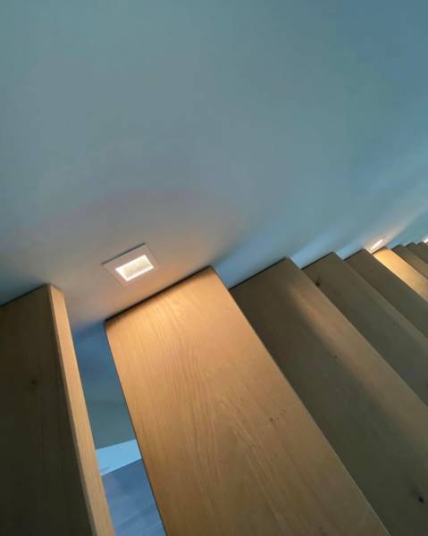 Nous avons installé des bandeaux LED, qui apportent une belle ambiance chaleureuse, économiques, ils donnent aussi une très jolie touche décorative. Des spots LED ont été installés pour plus de confort visuel et d'économie, les spots encastrés dans la montée d'escaliers offrent quant à eux à la fois un côté sécuritaire et esthétique.