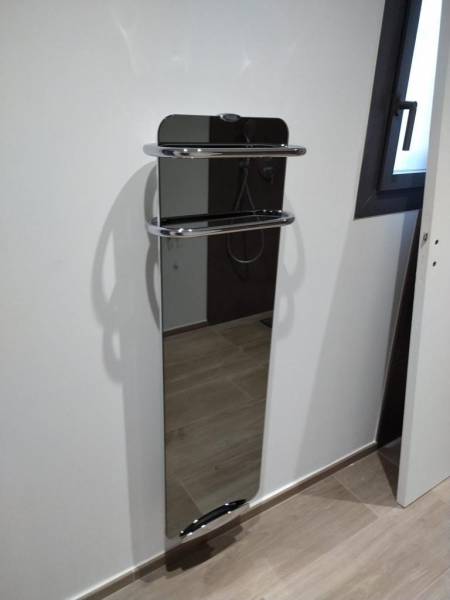 Une robinetterie encastrée chromée dans la douche ainsi qu'au niveau de la vasque viennent compléter cette salle de bain, avec un design épuré et facile d'entretien, elle donnera une touche de luxe à votre pièce. La vasque à poser rectangulaire vient accentuer ce côté moderne et esthétique. Le sèche-serviettes CAMPA effet miroir fumé, la glace en verre trempé brillante permet d'accumuler la chaleur et de la propager dans toute votre pièce, équipé d'une soufflerie discrète, il allie ainsi le design et la performance de haute qualité.