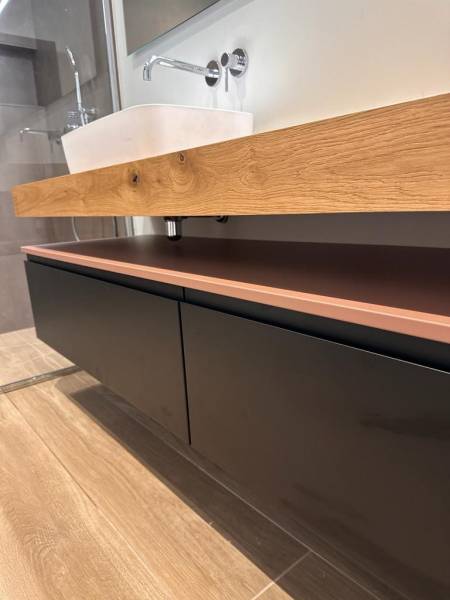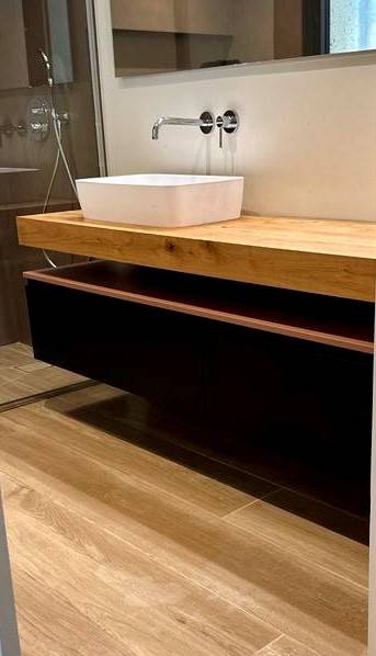 Le client a opté pour une salle de bain noire et bois, cela crée ainsi une ambiance design et élégante, un pari tendance dont vous ne vous lasserez pas. Lenoirformelevolume, tandisquelebois réchauffe l'atmosphère. Ensemble, ilsformentalorsunduoréussipour une salledebain apaisante.